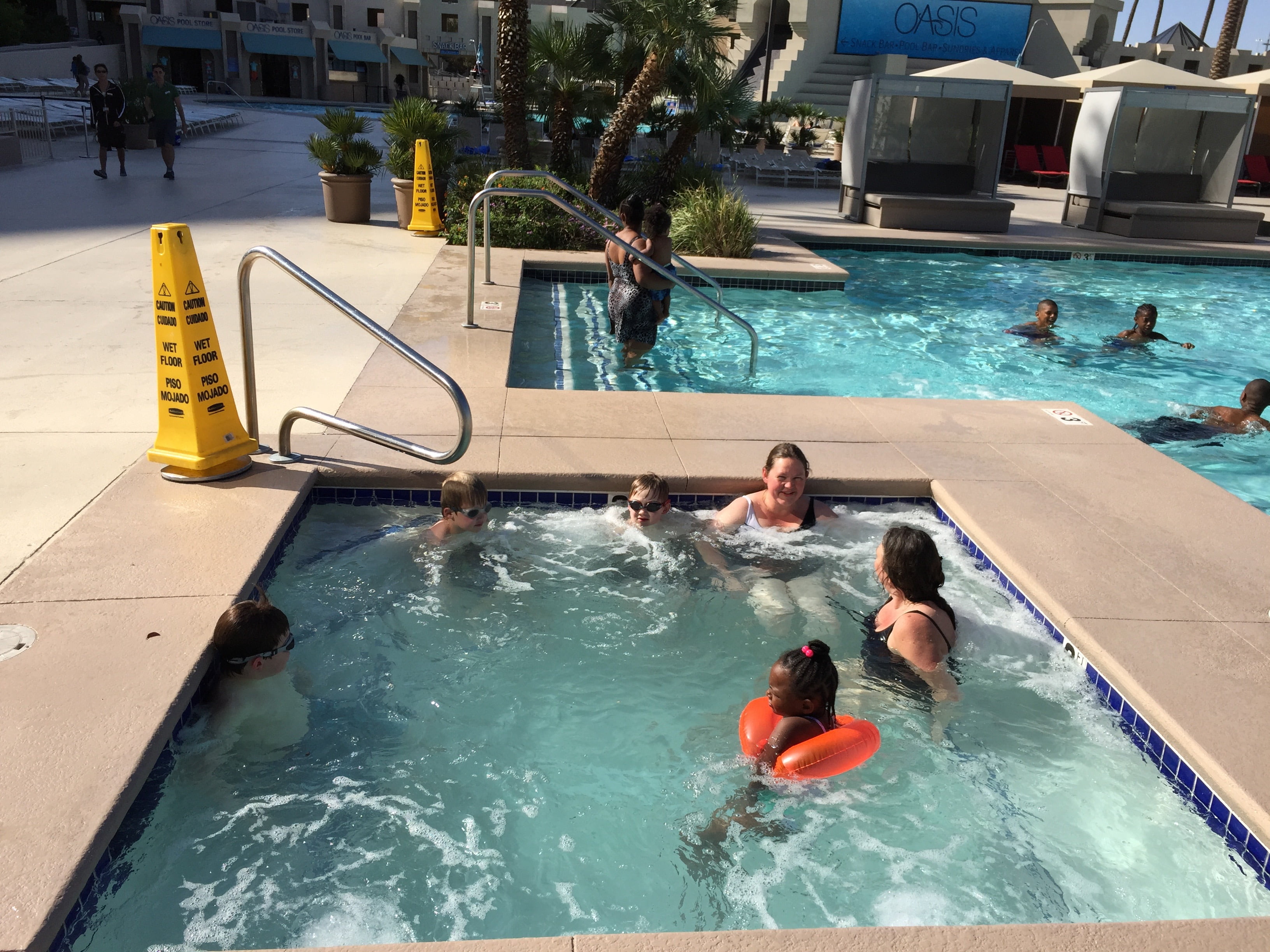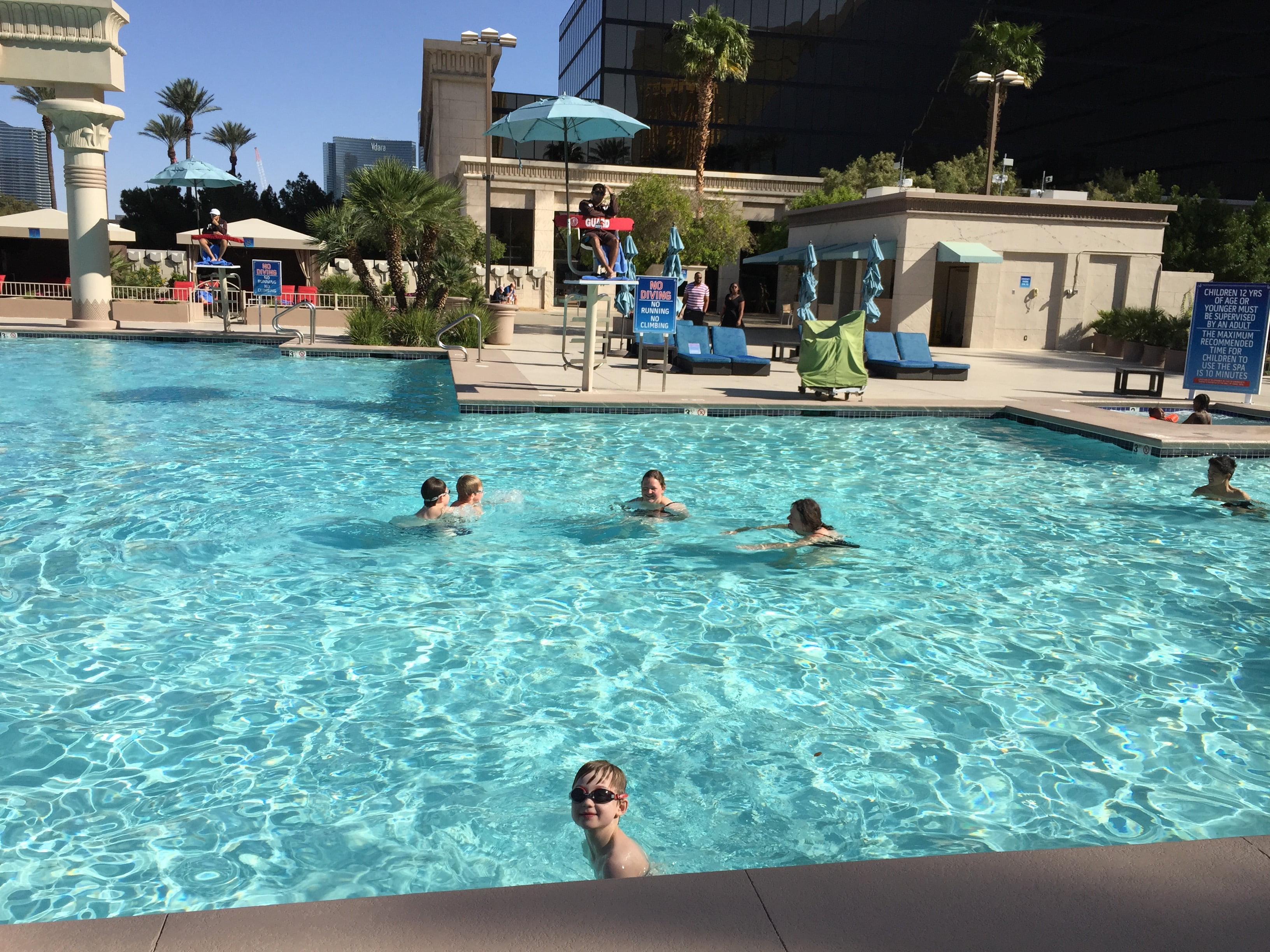 I går havde vi besluttet os for at vi ville springe morgenmaden over i dag og går direkte til frokost i en af de store buffeter i Las Vegas. Derfor startede vi dagen med en tur i hotellets pool. En kæmpe pool, men egentligt skuffende da der egentligt bare var tale om en stor lavt vandet pool uden nogen form for rutsjebaner eller andet sjov. Det var faktisk en rigtig kold oplevelse, solen var ikke rigtigt begyndt at varme endnu og det blæste en del, så turen blev lidt kortere end planlagt.
