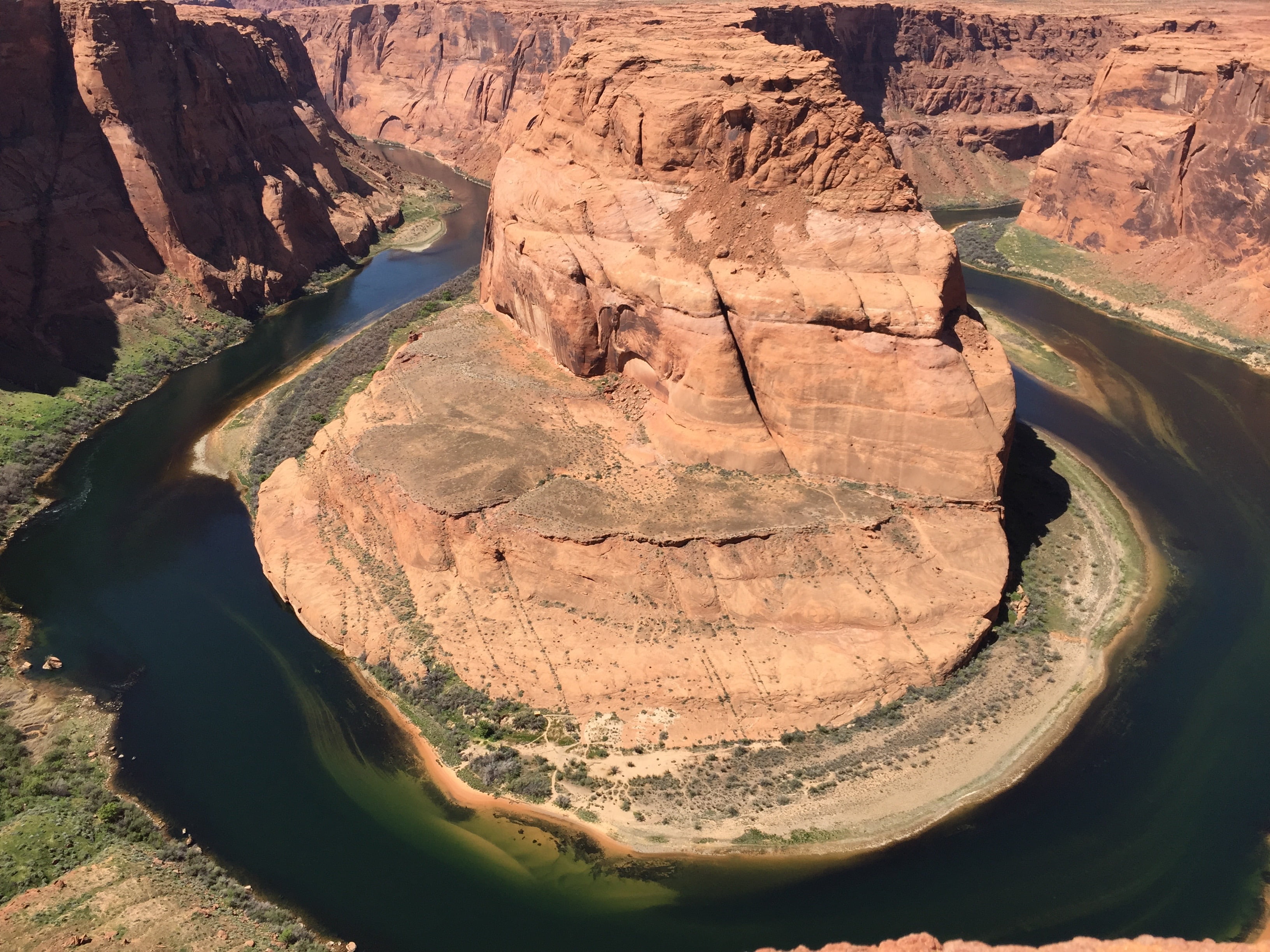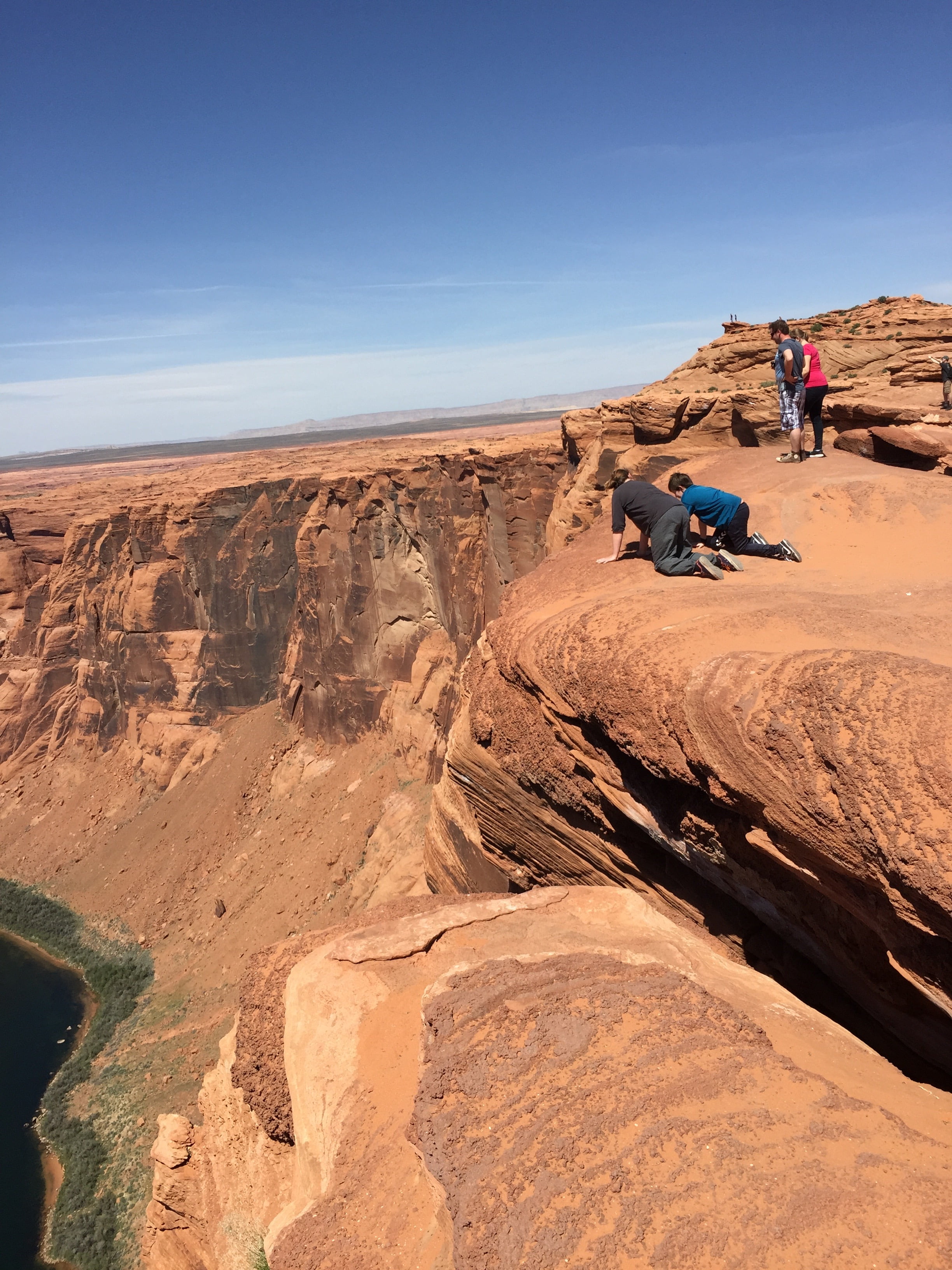 For at kunne se hele hesteskoen skal man helt ud på kanten af kløften, som i øvrigt er ca 305 meter dyb og med nærmeste lodret fald. Dette gav lidt hjertebanken og var noget af en udfordring for min højdeskræk, men jeg fik møvet mig helt ud til kanten (på maven) og fik taget set hele hesteskoen. Hold nu op var var den flot, den levede i den grad op til forventningerne, de andre fik også set hesteskoen men ikke det hele (men næsten..).