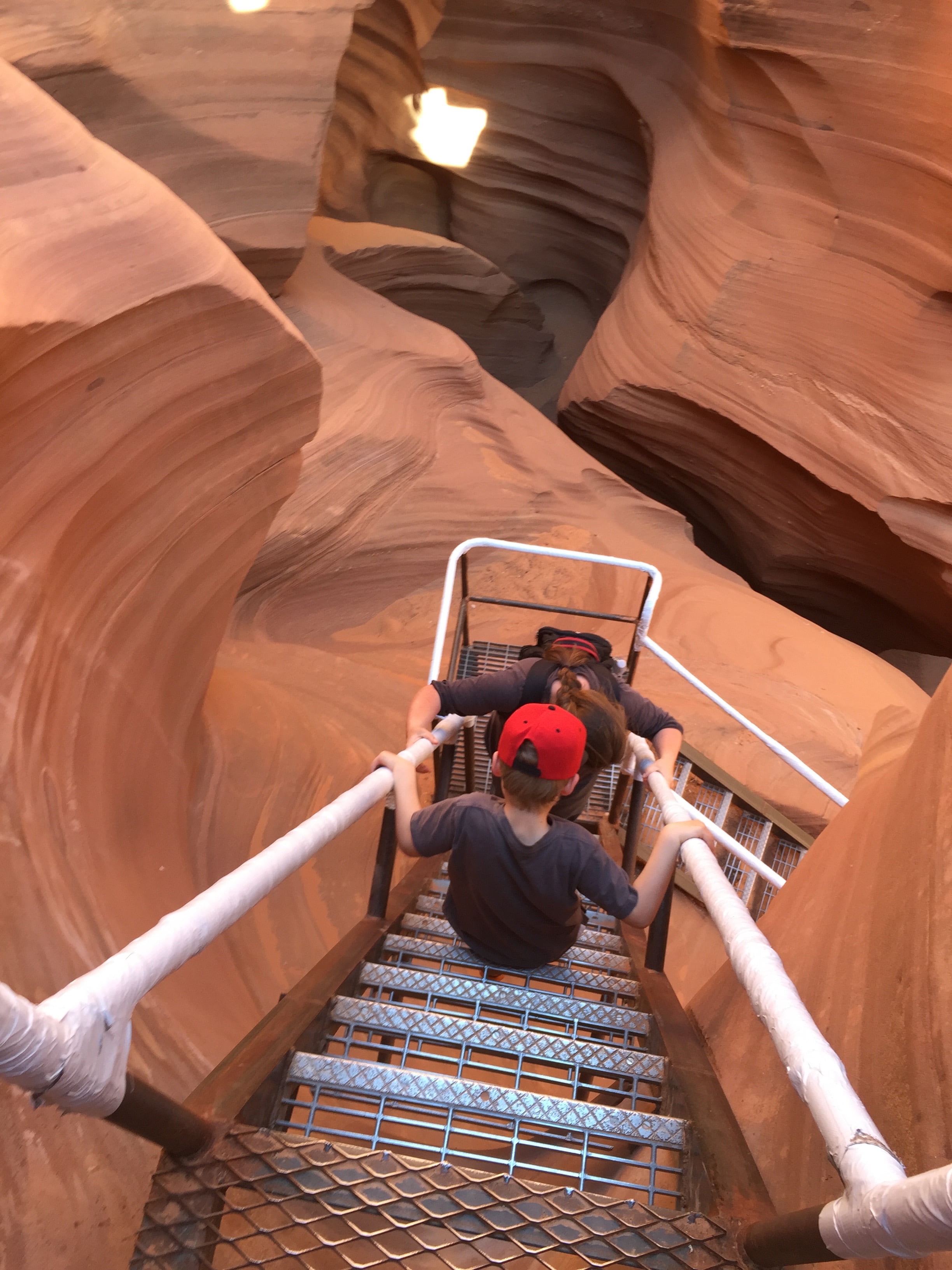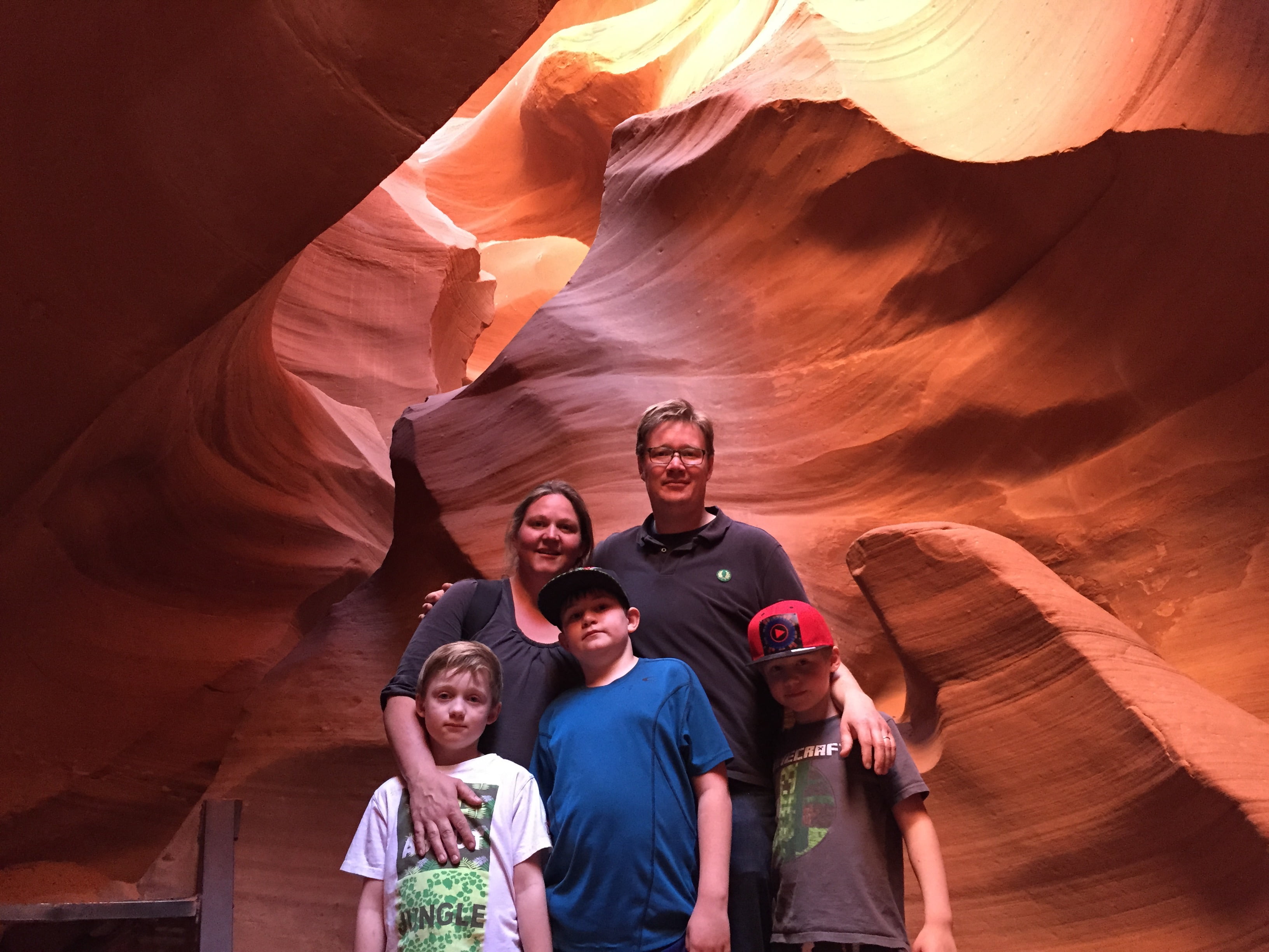 Antelope Canyon er i princippet en lang sprække i jorden som er dannet af vand og vind. Man kan kun besøge dem med guider og derfor er det selvfølgelig ikke en helt billig fornøjelse (vi gav 116 dollar eller ca 820 kroner for os fem). Jeg havde fået anbefalet Lower Antelope Canyon (af Trine) som er den mindst besøgte af de to Antelope Canyons (den anden heder Upper Antelope Canyon). Da jeg ikke har set den Upper kan jeg ikke sammenligne, men jeg kan sige at det var en utrolig oplevelse som både Winnie, drengene og jeg syntes var fantastisk.